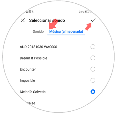 Ahora lo que debes hacer es seleccionar en la parte superior la pestaña de "Música (almacenada)". Verás que aparece un listado con toda la música que tienes descargada en el teléfono. Desde aquí selecciona aquella canción que quieres poner como tono de llamada y pulsa en la esquina superior el símbolo de aceptar.
