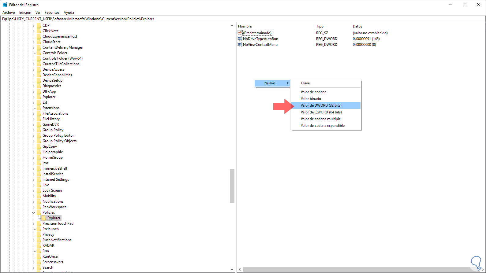 Allí daremos clic derecho sobre algún lugar libre y seleccionamos la opción Nuevo / Valor de DWORD (32 bits):