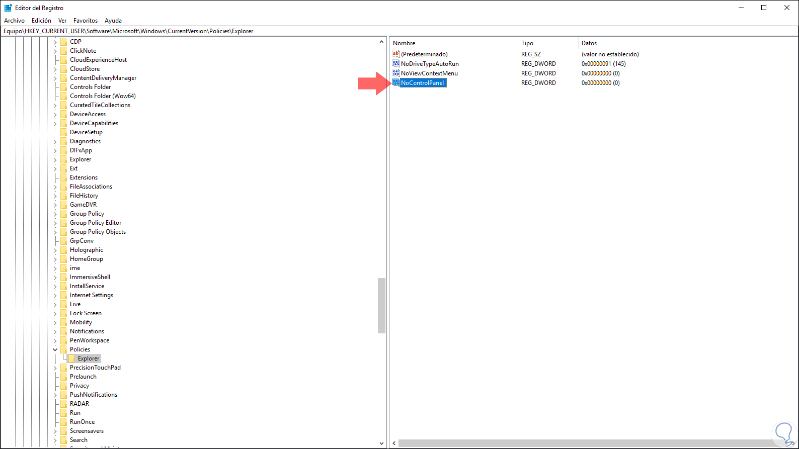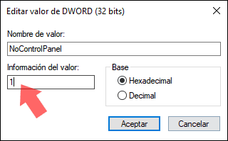 Este nuevo valor DWORD será llamado NoControlPanel. Daremos doble clic sobre este valor.