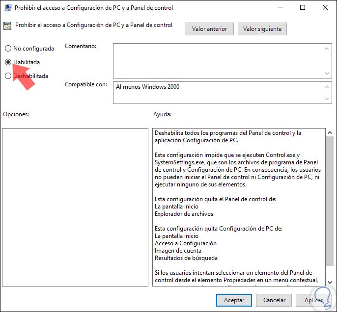Allí seleccionaremos la política llamada "Prohibir el acceso a Configuración de PC y a Panel de control" y daremos doble clic sobre ella, en la ventana desplegada activaremos la casilla "Habilitada" para impedir el acceso a dichas opciones: