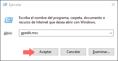 Para acceder al editor de políticas de grupo debemos usar la combinación de teclas Windows + R y ejecutar el siguiente comando. Pulsamos "Enter" o "Aceptar".
