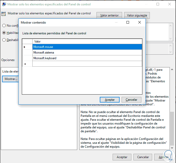 Aquí vamos añadiendo los elementos que queremos que sí aparezcan en el Panel de Control. Pulsamos en Aceptar y después en Aceptar y Aplicar