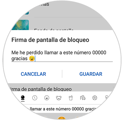 A continuación verás que aparece una ventana emergente en la que debes escribir el texto que quieras poner en la pantalla de bloqueo de tu Huawei. Una vez escrito, debes seleccionar "Guardar".
