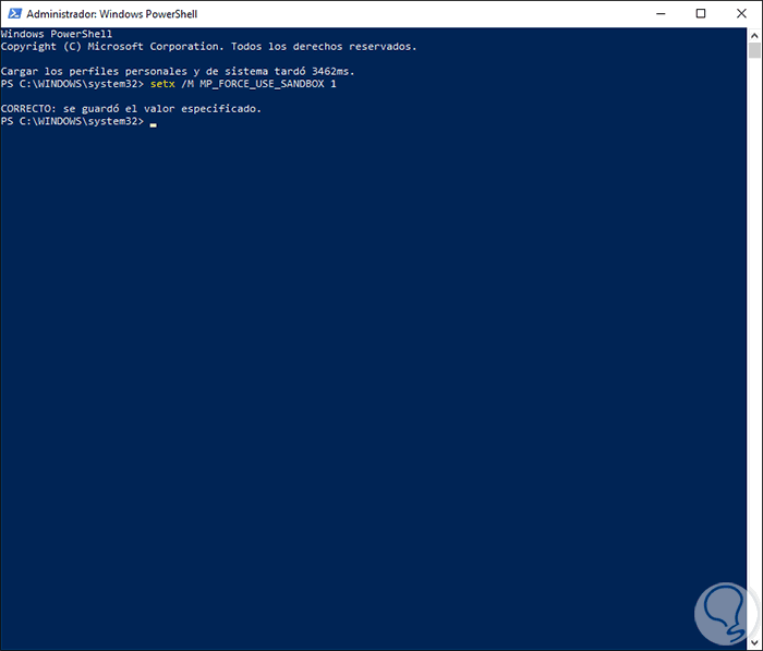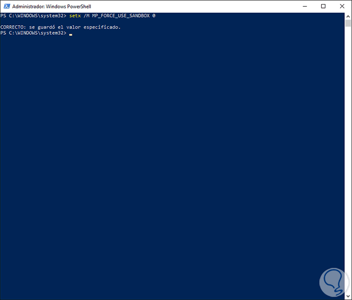 Para desactivar el modo sandbox, debemos acceder de nuevo a Windows PowerShell y esta vez ejecutar lo siguiente: