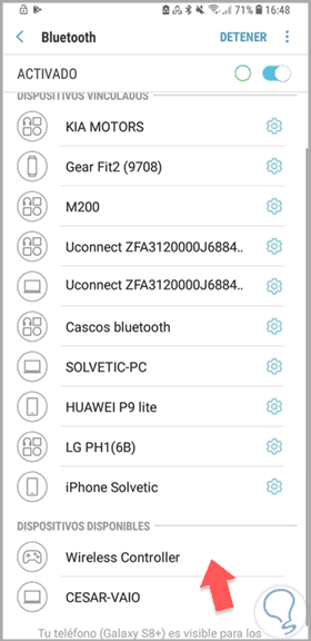 Pulsa sobre la opción o sobre “Escanear” o “Buscar” y verás como comienza a buscar dispositivos. Presiona sobre el controlador de la PS4 para conectarlos en disponibles llamado “Wireless Controller”.