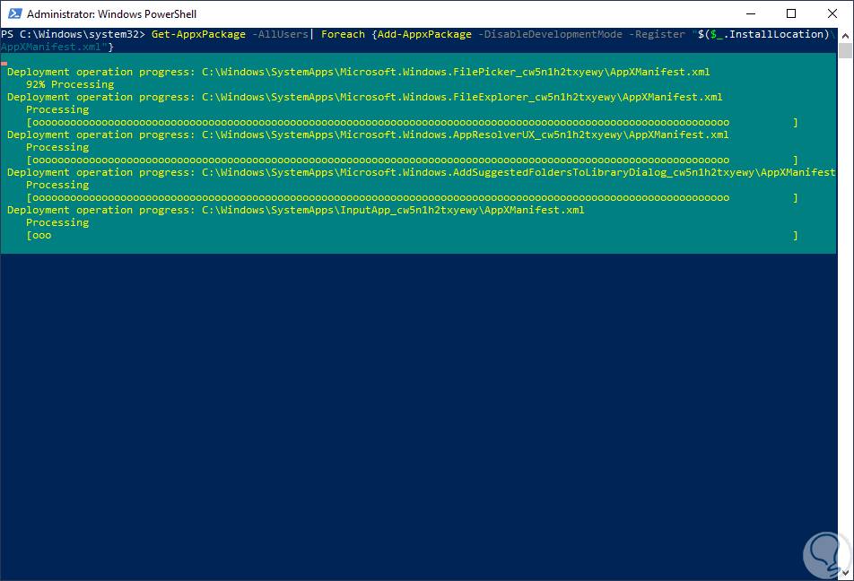 Get-AppxPackage -AllUsers| Foreach {Add-AppxPackage -DisableDevelopmentMode -Register “$($_.InstallLocation)\AppXManifest.xml”}