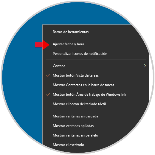 Haz clic derecho sobre la fecha y reloj de tu barra de tareas para desplegar el menú.