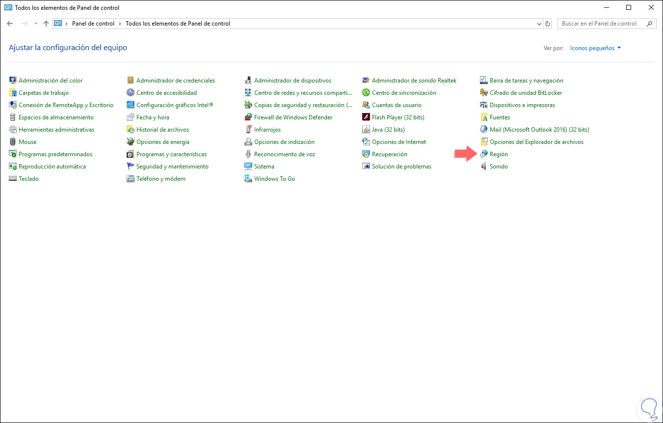 Para dar inicio a este proceso, accedemos al panel de control y allí vamos al campo “Ver por” y seleccionamos la opción “Iconos pequeños”, serán desplegadas todas las categorías del panel de control así: