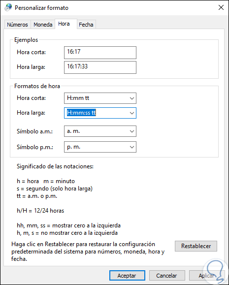 Allí reemplazamos la "h" en los campos de Hora corta y Hora larga a "H" para cambiar al formato de 24 horas. Para eliminar AM y PM, eliminaremos las letras "tt" de las casillas de Hora corta y Hora larga.