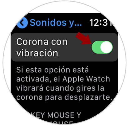 La otra opción que podemos encontrar disponible en “Corona con vibración” Si activamos esto, el Apple Watch va a vibrar cuando giremos la corona para desplazarnos.