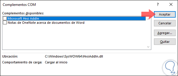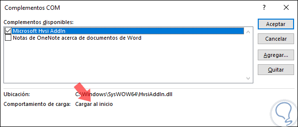 Seremos redireccionados a la siguiente ventana. Allí, los complementos que están activos, son los que se cargan al inicio de Word, Excel o PowerPoint, notemos en la parte inferior la leyenda "Cargar al inicio".