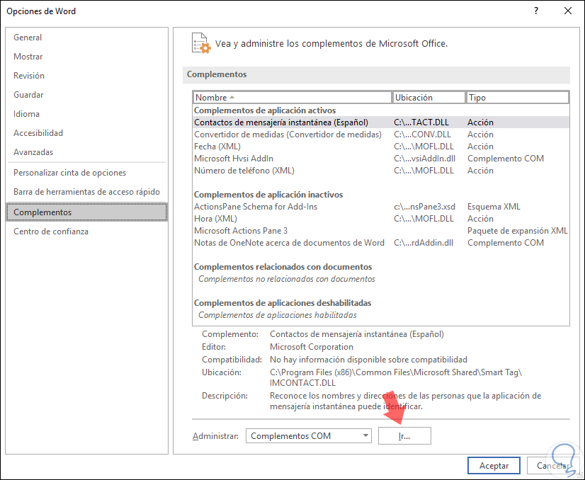Al pulsar allí será desplegada la siguiente ventana emergente donde debemos ir a la sección "Complementos" la cual tendrá el siguiente aspecto. Allí podemos ver todos los complementos instalados. Ahora, vamos a la sección "Complementos de aplicación activos", para visualizar todos los complementos activos, pulsamos en el botón "Ir" ubicado en la parte inferior.