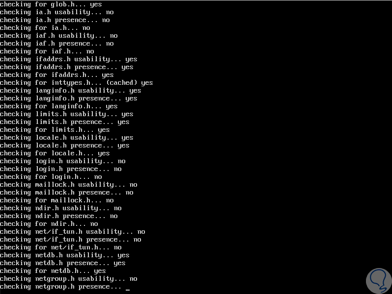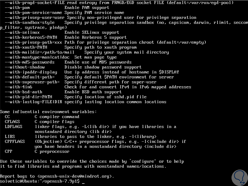 El siguiente paso es construir e instalar el servidor OpenSSH a través de las opciones "--with-md5-passwords, --with-privsep-path y --sysconfdir", los cuales instalarán todos los archivos en el directorio /usr/local/ la cual es la instalación predeterminada PREFIX. Para ver todas las opciones disponibles vamos a ejecutar “./configure -h” y a partir de allí será posible personalizar la instalación según sea necesario:
