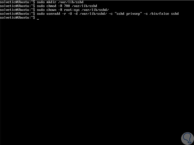 sudo mkdir /var/lib/sshd sudo chmod -R 700 /var/lib/sshd/ sudo chown -R root:sys /var/lib/sshd/ sudo useradd -r -U -d /var/lib/sshd/ -c "sshd privsep" -s /bin/false sshd