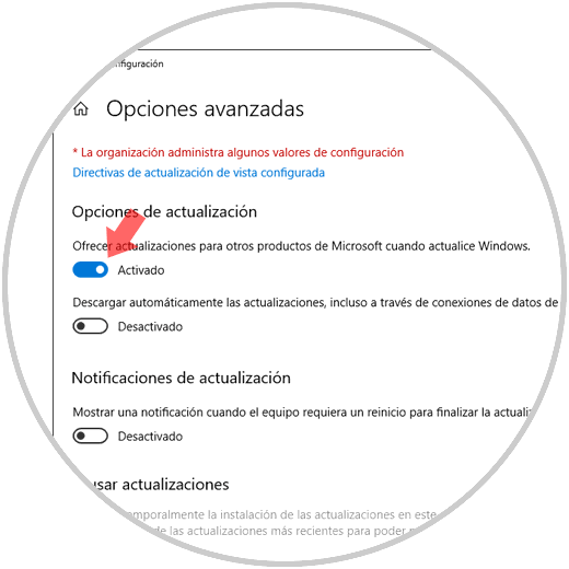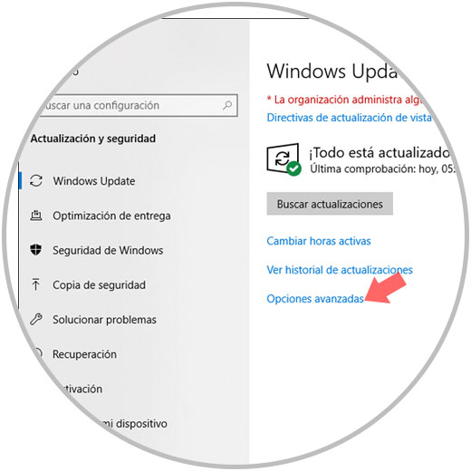 En la nueva ventana vamos a la sección Windows Update. Allí damos clic en la línea "Opciones avanzadas".