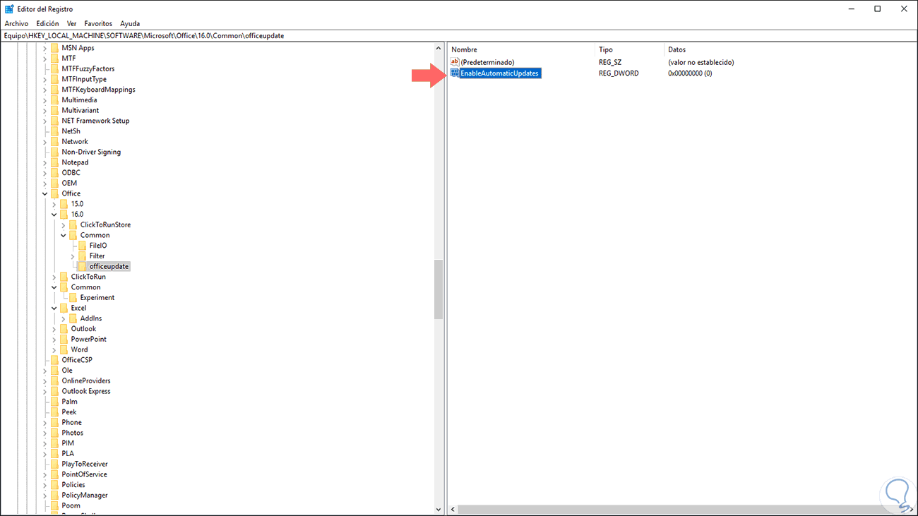HKEY_LOCAL_MACHINE\SOFTWARE\Microsoft\Office\16.0\Common\officeupdateAllí debemos dar doble clic sobre el valor DWORD llamado EnableAutomaticUpdates y en el campo Información del valor asignar el número cero (0), para desactivar estas actualizaciones.