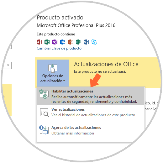Si deseamos activar de nuevo las actualizaciones pulsamos de nuevo en este botón y seleccionamos la opción "Habilitar actualizaciones":