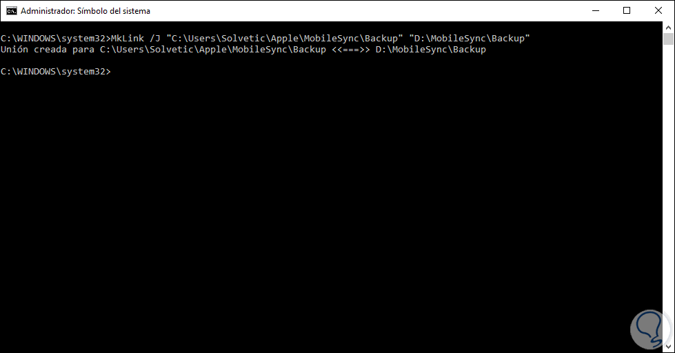 MkLink /J “C:\Users\Usuaurio\AppData\Roaming\AppleComputer\MobileSync\Backup” “D:\MobileSync\Backup”El resultado será el siguiente: