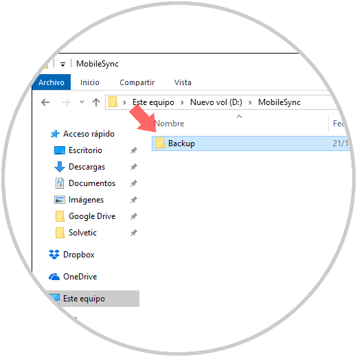 Para este método, crearemos una carpeta en la unidad donde se ha de guardar la copia de seguridad de iTunes y allí crearemos la carpeta MobileSync, dentro de esta vamos a crear una subcarpeta llamada Backup, en este caso será la ruta D:\MobileSync\Backup.