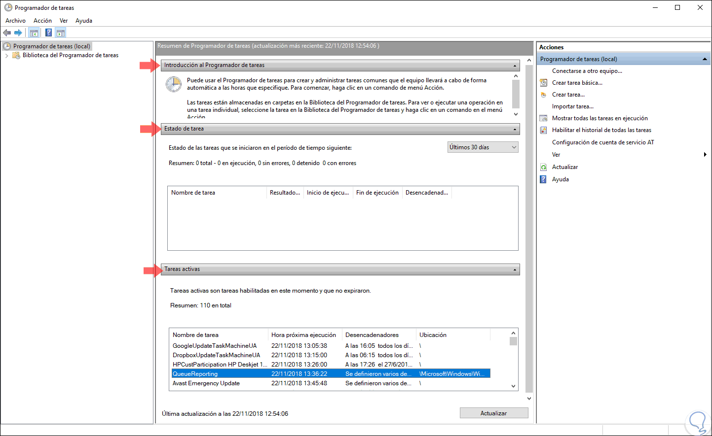 En el panel central del Programador de tareas podemos ver tres secciones que son: