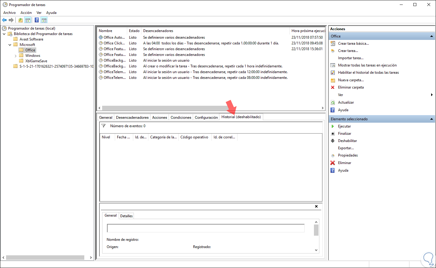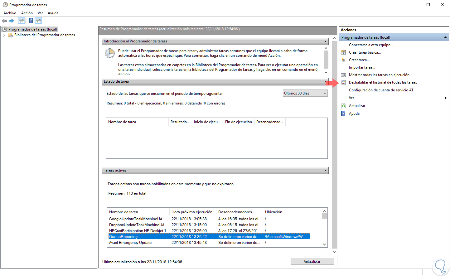 Por defecto, el Programador de tareas de Windows 10 puede no desplegar algunas tareas realizadas. Esto se debe a que el historial de tareas se inhabilita con el fin de ahorrar espacio, de modo que si deseamos acceder a todas las tareas debemos pulsar en la línea Habilitar el historial de todas las tareas ubicado en el panel lateral derecho, podremos ver que esta línea pasa a ser Deshabilitar el historial de todas las tareas: