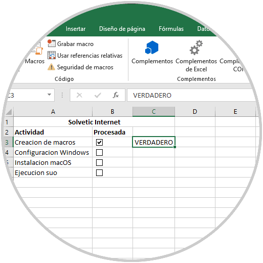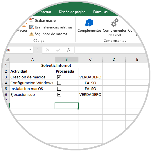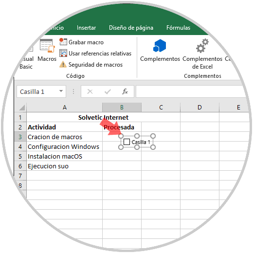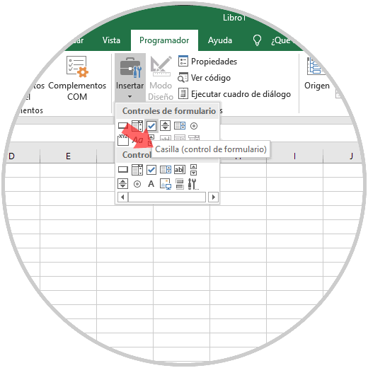 Una vez registrados los datos, vamos al menú "Programador" y en el grupo "Controles" pulsamos sobre "Insertar" y allí damos clic en la opción "Casilla" (control de formulario):