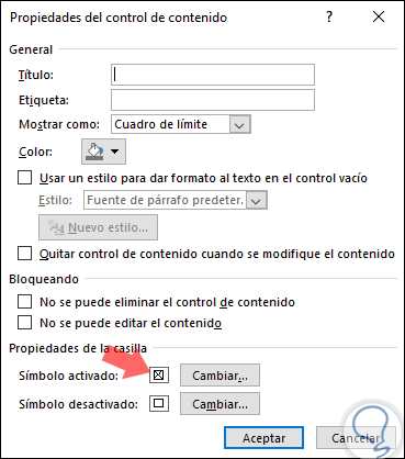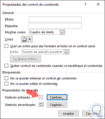 Se desplegará la siguiente ventana emergente y allí vamos a la sección "Propiedades de la casilla". Como vemos, disponemos de la opción "Símbolo activado" la cual por defecto despliega la letra X. Pulsamos en "Cambiar".