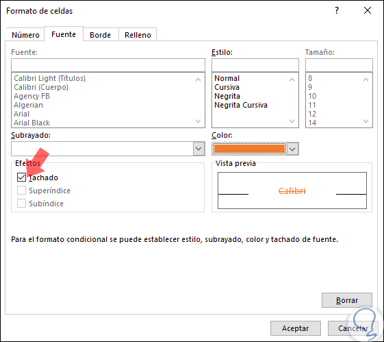 Allí activamos la casilla "Tachado" y elegimos el color deseado. Damos clic en "Aceptar".
