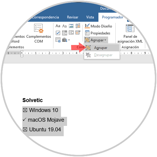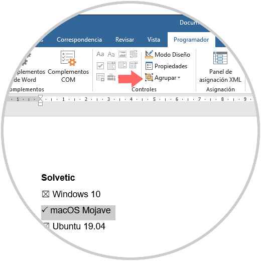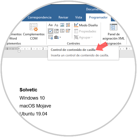 Ahora disponemos del menú Programador en Word 2019, allí accedemos y en el grupo "Contenido" seleccionamos "Control de contenido de casilla":