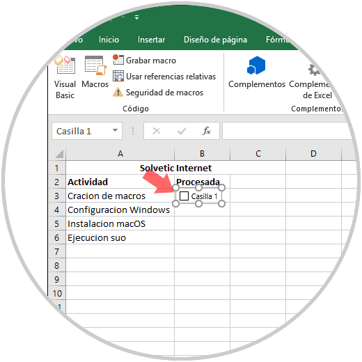 Al dar clic allí, debemos pulsar en la celda donde se ha de insertar la casilla de verificación: