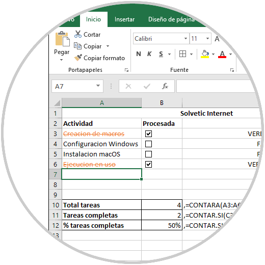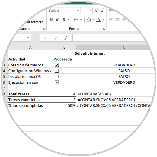 =CONTARA(A3:A6) Para obtener todas las tareas completas usaremos: =CONTAR.SI(C3:C6;VERDADERO) Para obtener el porcentaje de las tareas realizadas: =CONTAR.SI(C3:C6;VERDADERO) /CONTARA(A3:A6)