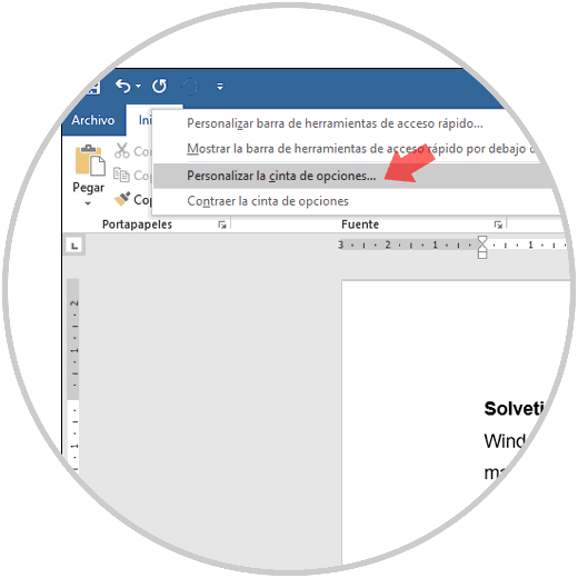 Para hacerla visible, debemos dar clic derecho en algún lugar de la cinta de opciones de Word y allí seleccionar la línea "Personalizar la cinta de opciones":