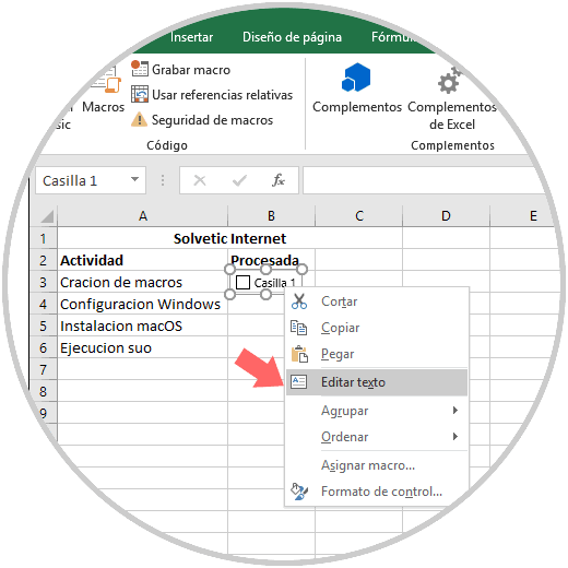 Para eliminar el texto "Casilla 1", damos clic derecho en la casilla de verificación, seleccionamos el texto y lo eliminamos, también es posible dar clic derecho en la casilla de verificación, seleccionar "Editar texto" en el menú contextual y luego eliminar el texto desplegado: