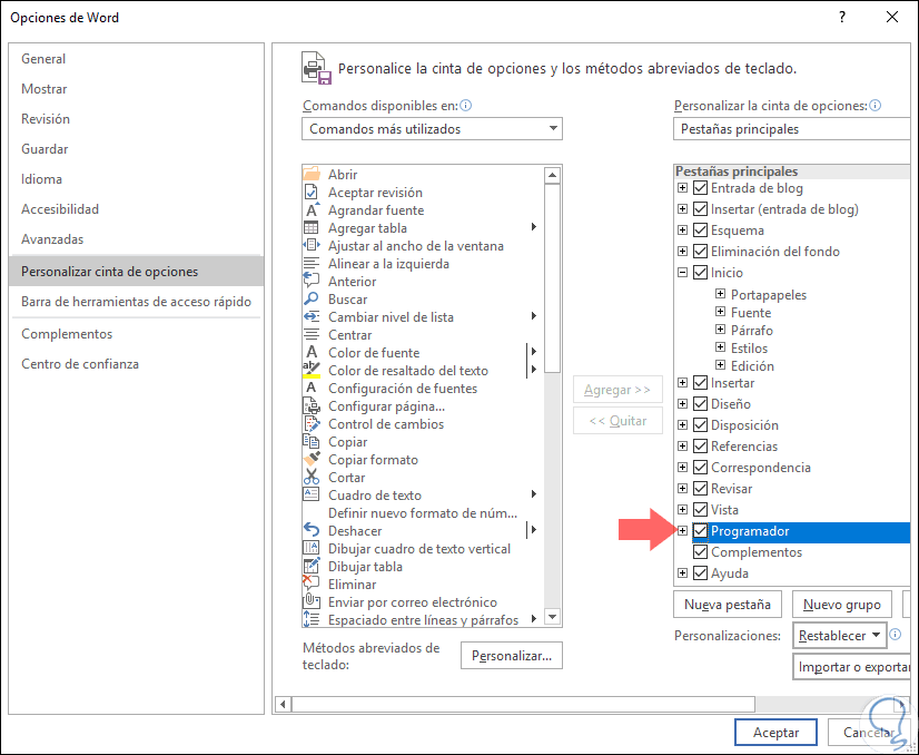 Se desplegará la siguiente ventana y en la columna lateral derecha debemos activar la casilla "Programador". Pulsamos en "Aceptar" para aplicar los cambios.