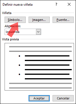 Allí pulsamos en la opción "Viñetas". En la lista desplegada seleccionamos la línea "Definir nueva viñeta":