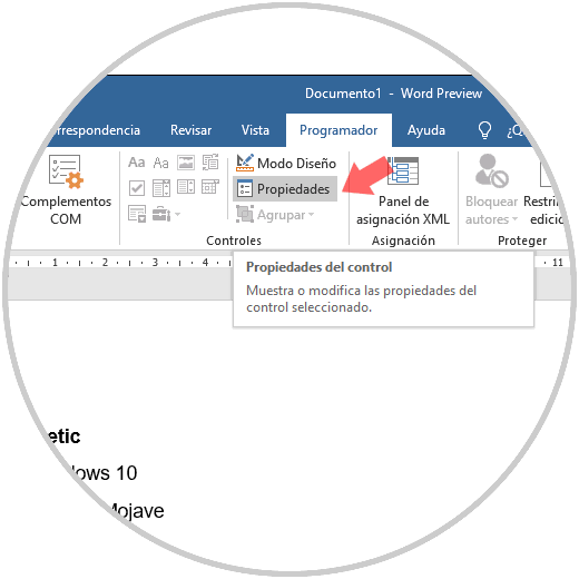 Para esto, seleccionamos el cuadro de casilla y vamos al menú "Programador" y en el grupo "Contenido" seleccionamos la opción "Propiedades":