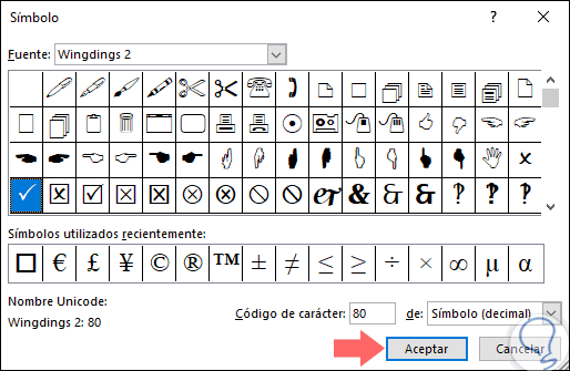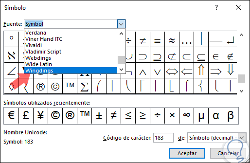 Podemos elegir alguna de las fuentes disponibles y seleccionar el símbolo deseado. Pulsamos en "Aceptar".