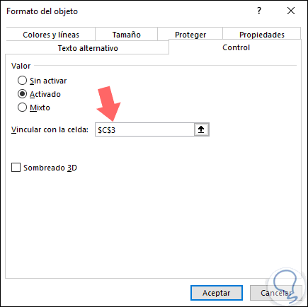En la ventana desplegada, en el cuadro "Vincular con la celda" debemos seleccionar una celda vacía en la hoja a la que desea enlazar con la casilla de verificación. Pulsamos en "Aceptar".