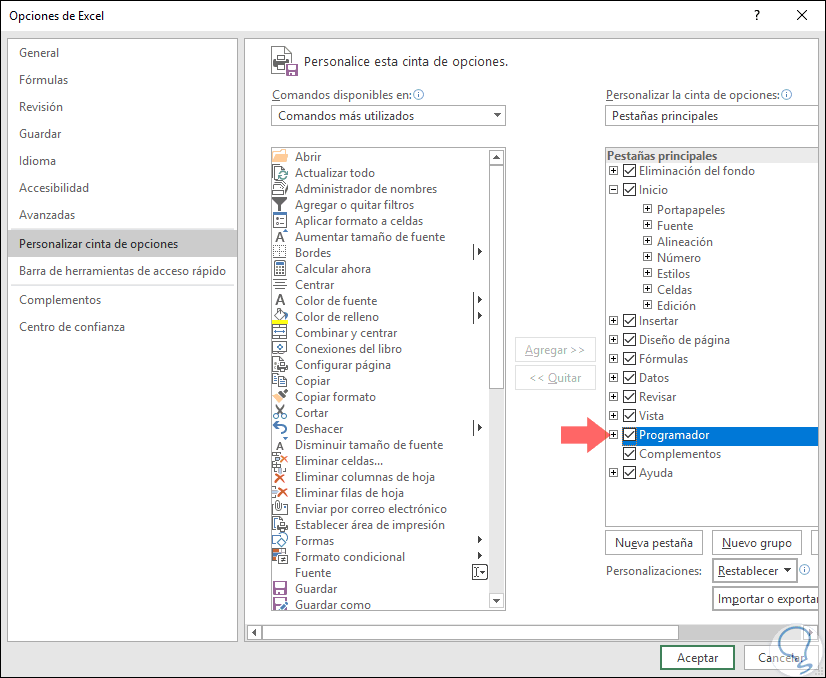 En la ventana emergente desplegada, activamos la casilla "Programador en el costado lateral derecho". Pulsamos en "Aceptar" para añadirla a la cinta de opciones de Excel 2019. Luego de esto debemos contar con los datos que han de ser usados en la verificación de una forma organizada.