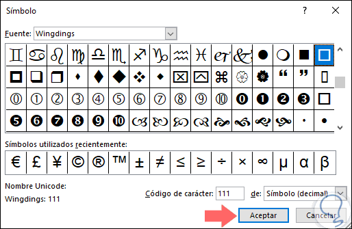En las opciones desplegadas seleccionamos el cuadro cuyo código de carácter es 111. Ahora, pulsamos en "Aceptar".