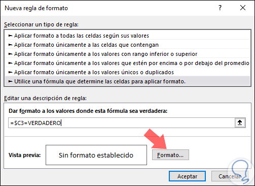 =$C3=VERDADEROPulsamos en el botón "Formato".
