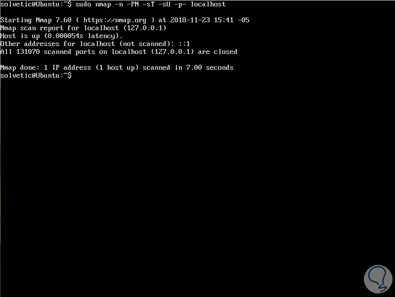 sudo apt install nmap (Debian/Ubuntu)sudo yum install nmap (CentOS/RHEL)sudo dnf install nmap (Fedora)Luego de esto, para escanear todos los puertos abiertos o de escucha en Linux, vamos a ejecutar el siguiente comando: