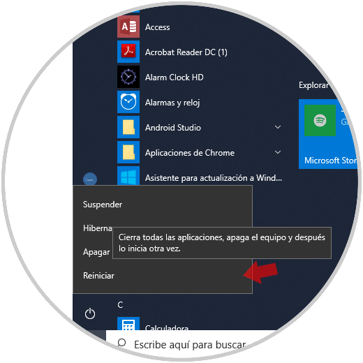 Para usar este método debemos ir al menú "Inicio", pulsar en el icono de apagado y, junto con la tecla Alt, dar clic en la opción "Reiniciar":