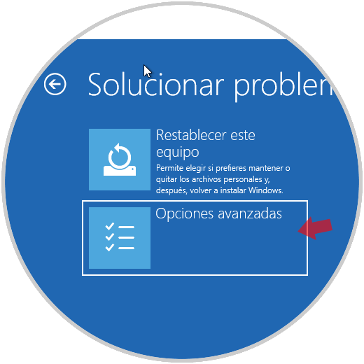 Al acceder a las opciones avanzadas de reinicio en Windows 10 veremos lo siguiente. Allí seleccionamos la opción "Solucionar problemas" y pulsamos "Enter".