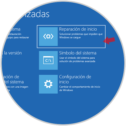 Veremos lo siguiente. Allí debemos dar clic en la opción "Reparación de inicio".
