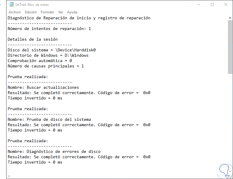 C:\Windows\System32\Logfiles\SrtAllí ubicamos un archivo llamado SrtTrail.txt el cual alojara toda la información del análisis ejecutado. Como vemos, se indica cada prueba ejecutada con su resultado y tiempo de ejecución.