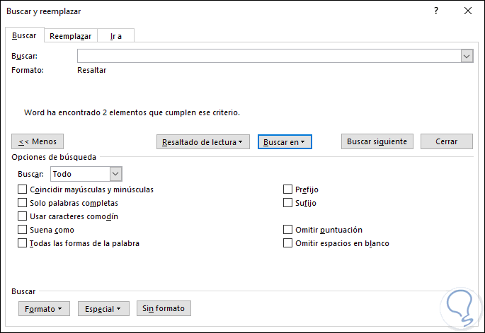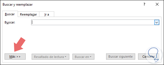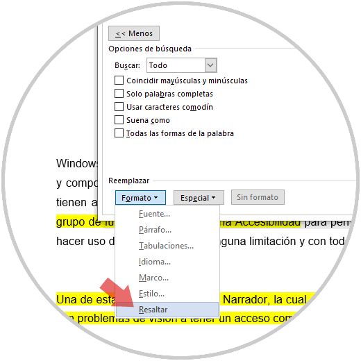 Allí vamos a la pestaña Buscar y damos clic en la línea Mas ubicada en la parte inferior y al pulsar en el botón Formato seleccionaremos la opción Resaltar: