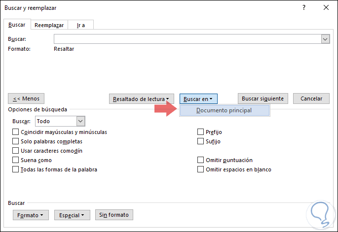 Al seleccionar esta opción se desplegará dentro de las opciones de formato y en el campo Buscar en debemos seleccionar la opción Documento principal: