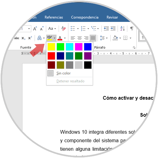 Para usar este método, seleccionamos el texto a resaltar e iremos al menú Inicio y en el grupo Fuente damos clic en la opción Color de resaltado de texto donde veremos lo siguiente: