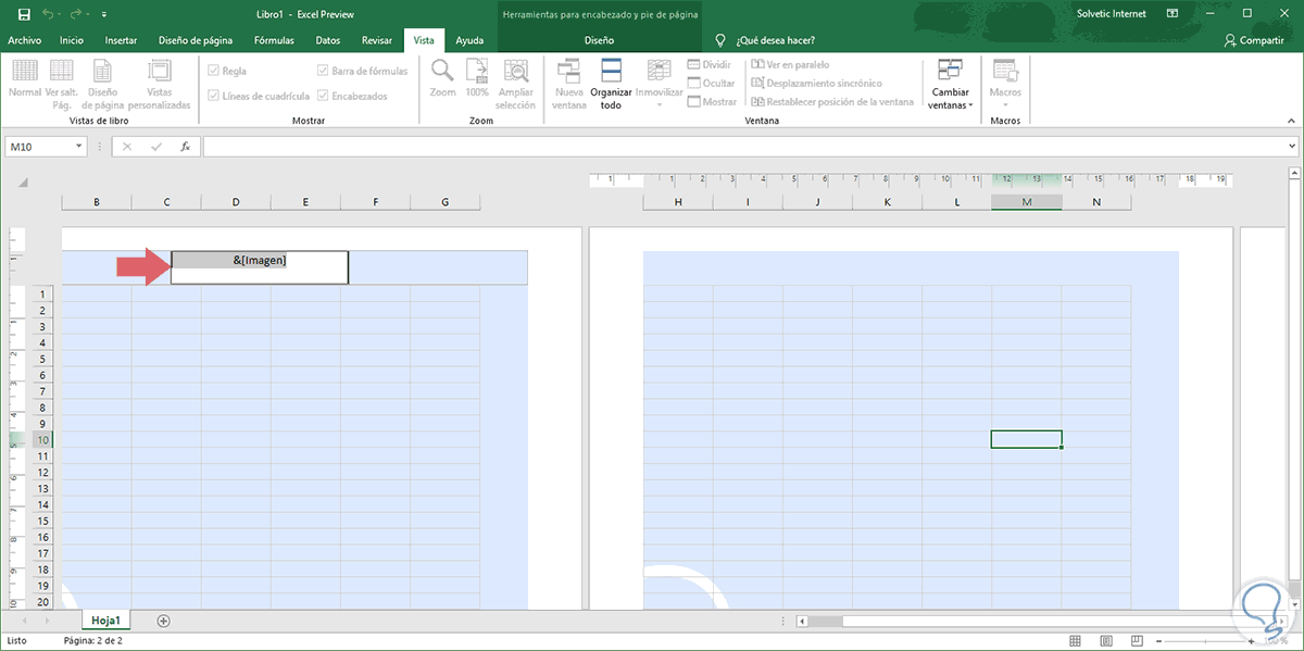 Si es a través de los encabezados, debemos ir al menú Vista y allí seleccionar Diseño d página¸ ahora seleccionamos la cadena &[Imagen]: